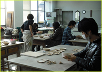 工芸の中でも陶芸を活動の主体としています。 4年間のあいだに、手びねり成形やロクロ成形、タタラ成形、鋳込み成形など基礎的な成形技法を習得するのと同時に、象嵌や透かし彫り、絵付けなど様々な装飾技法を習得していきます。また、色や質感を追求するための素材研究も行い、発想の幅を広げていくことを目標としています。自身が表現したいものは何なのか?工芸でつくる意味とは?そんなやりとりをしながら日々追求しています。
