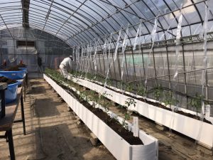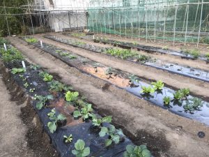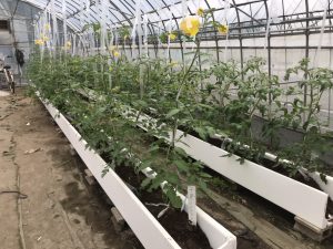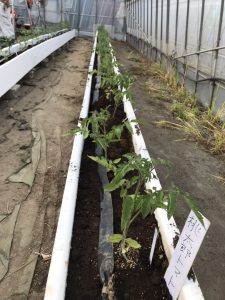 ハウス内でのトマトの定植ができるようになりました。例年袋栽培にておこなってきましたが、今年はこんなかたちでイチゴ用のベンチを使いハウス栽培を行います。