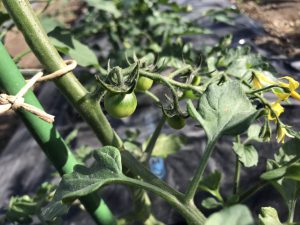 まだ赤くはなっていませんが、露地のミニトマトは鈴なりです。ハウスのトマト・ミニトマトも大きくなり、わき芽も生長しています。