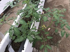 トマトのわき芽が大きくなりつつあります。主枝に栄養がいくように、はやめに摘み取ってください。 ハサミを使うと病気に感染するおそれがあるので、小さいうちは手で摘み取って下さい。それから、小さいキュウリと小さいミニトマトができています。収穫まではまだまだですが、楽しみですね。
