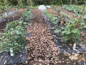 本日、落葉を敷きました。実習地では畝間の除草代わりに落葉を敷き、光が当たらず、物理的に雑草が生えにくい環境にしています。自然と土に返り、腐葉土になることで畑の土壌改良にも一役かっています。