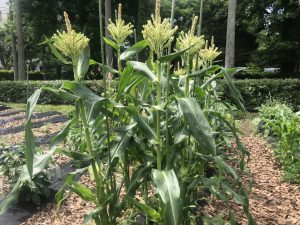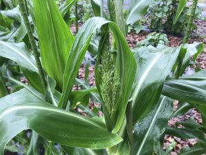 トウモロコシの雄花が咲き始めました。受粉時期には晴れていますように・・・。