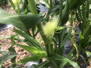 トウモロコシも雌花が咲きました。雨が降っていないので、受粉は成功していると思います。あとはアワノメイガなどの虫が来ないように、見つけしだい駆除してください。雄花は切り取って下さい。