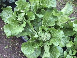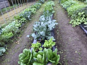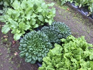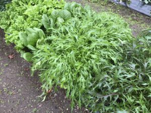 本日の様子。ミズナやターサイ、サンチュなど収穫できますね。