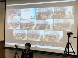 新生徒会始動し、約3か月が過ぎました。そこで、生徒会本部役員が作成したアンケートをもとに今の取組の現状や今後について検討する集会を行いました。写真は、多目的ホールでスタジオにして、プレゼンを行い、その様子を各教室に発信している様子です。その中では、各専門部からの取組についても説明があり、今後どのように附属中の生活を充実させるればよいのかなどの提案がありました。新年度を迎える前に、自分たちの活動を振り返り、次に繋げるよい機会となったのではないでしょうか。
