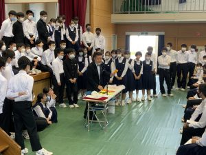 生徒朝会(校歌とスクールカラー)