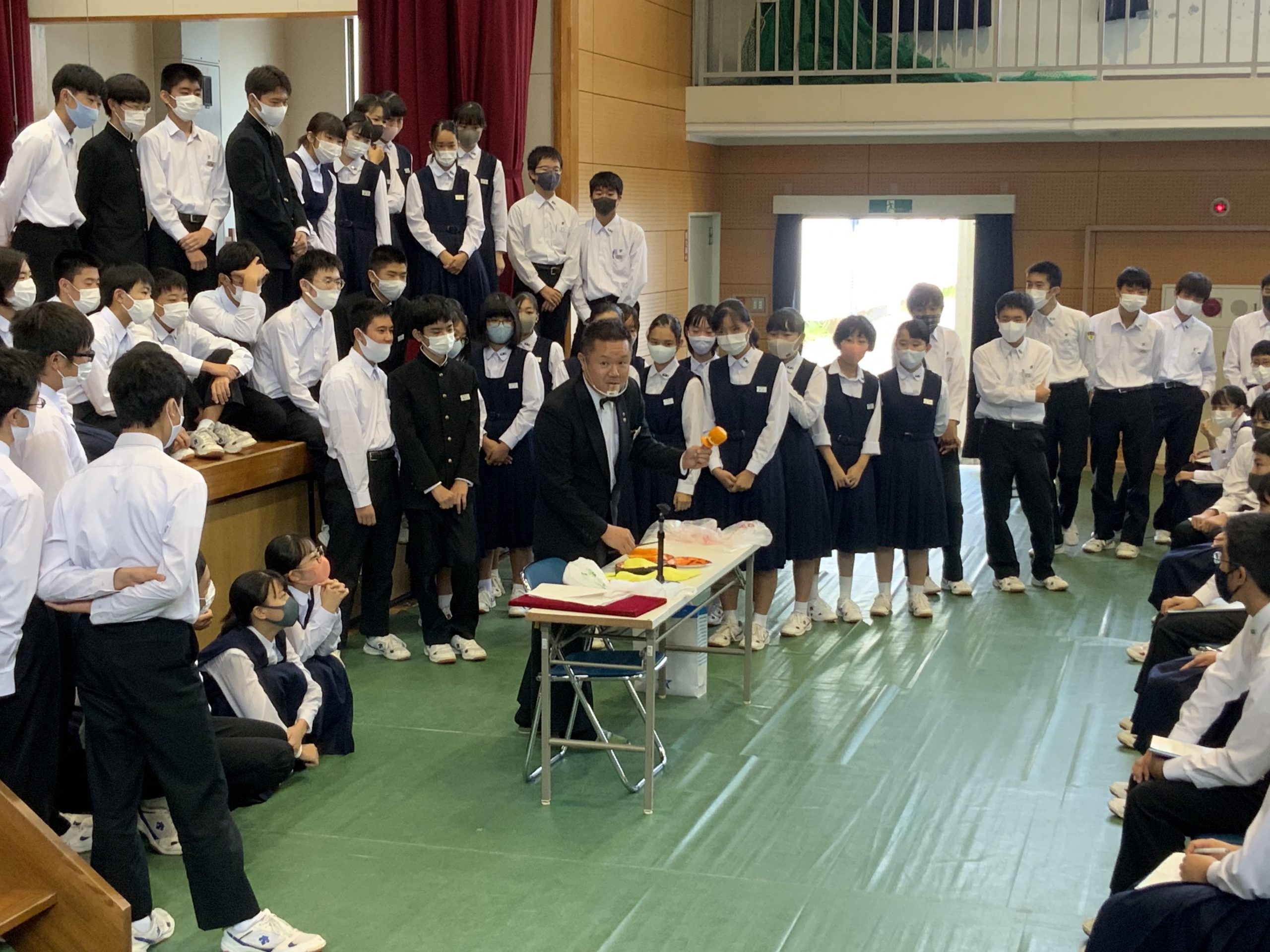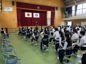 本日、マジオドライバーズスクール鹿児島校の講師の方をお招きして、交通安全教室を実施しました。1年生のみ体育館でお話を直接きき、2・3年生は、各教室で大型モニターを用いての視聴となりました。今回の講話では、特に歩行時や自転車運転時の交通規則について、動画やスライドを用いて丁寧に説明してくださいました。最後に、新生徒会環境委員長がお礼の言葉を述べ、そして、副校長より講評があり、充実した一時間とすることができました。御多用中にもかかわらず、お越しいただいた講師の先生、本当にありがとうございました。