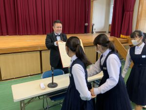 今週の全校集会は、テレビ会議システムを用いて、2年生のみ体育館、他の学年は教室にて、任命式が行われました。式では、3年生の旧専門委員長からのあいさつがあり、10専門部で正副委員長が腕章を引継ぎが行われました。また、新専門委員長を代表して、生活委員長からあいさつがあり、これで新生徒会が完全に発足することになりました。