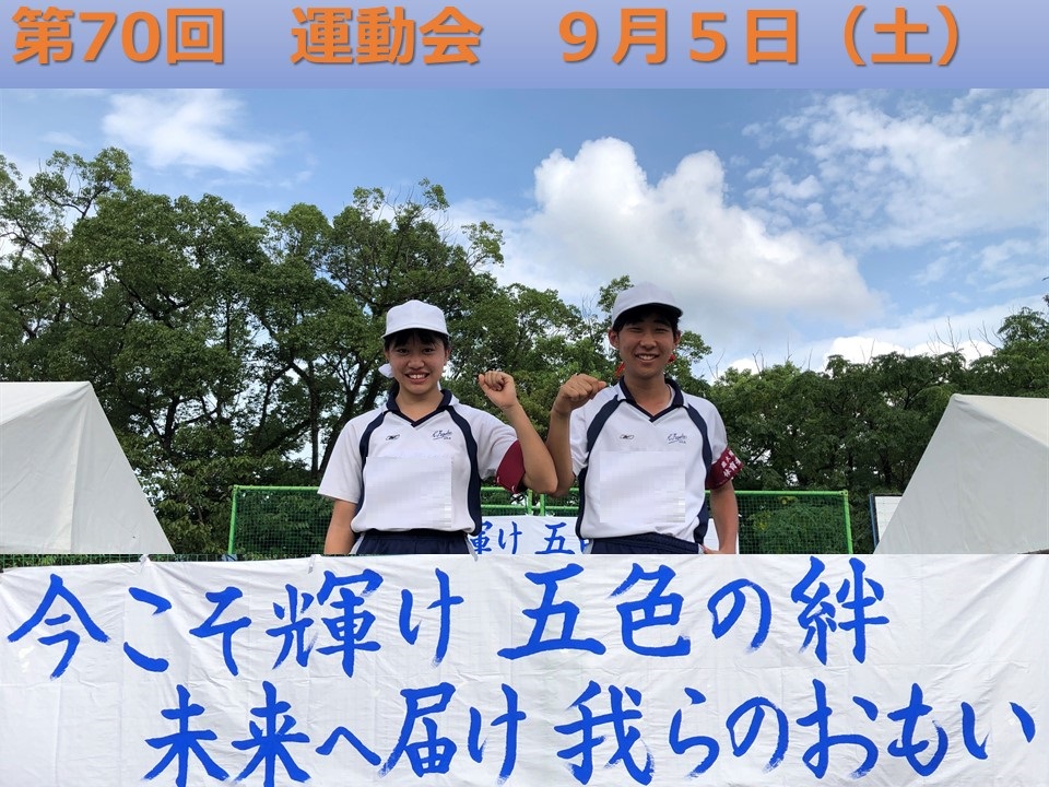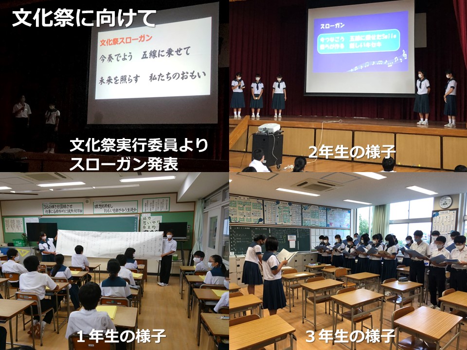 運動会が終わり、文化祭に向けてのスローガン発表が行われました。本校の文化祭の企画・運営は、生徒会本部役員、そして、文化祭実行委(各学級代議員で組織)が中心となって行われます。写真左上は、今回の文化祭スローガンを文化祭実行委員長・副委員長が発表している様子です。このスローガン発表を受け、各学年ごとで形は異なりますが、文化祭への取組がスタートすることになります。