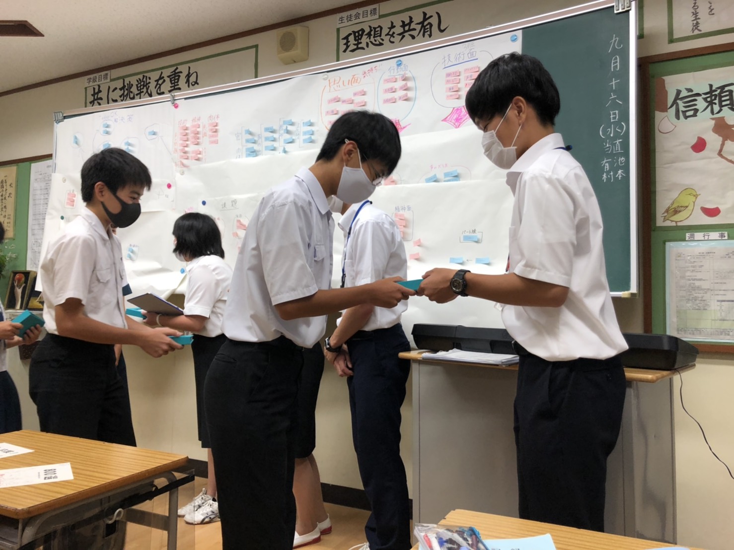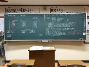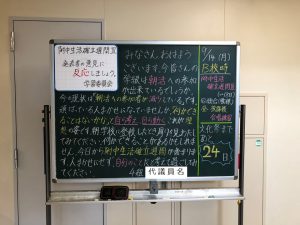 9/18(金)に生徒会立会演説会が行われ、その後、学年毎にそれぞれの場所に分かれて即日投票、開票作業が行われます。写真の黒板は、各学級の選挙管理委員が、その流れを説明するためにかいたものです。この黒板を用いて、当日の朝に投票の仕方、注意点を各学級毎に詳しく説明し、円滑な投票を促します。丁寧に書かれた黒板の姿に、選挙管理員の責任感の強さがみえました。
