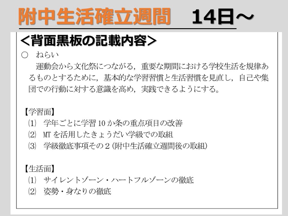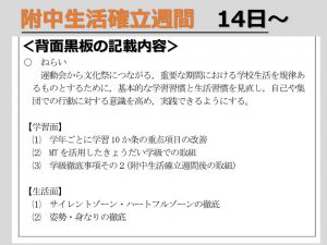 本日より、各教室の背面黒板には、以下の内容が書かれ、確立週間が始まりました。このタイミングで実施される目的は2つあります。それは「運動会から文化祭への切り替え」と「教育実習を通して、更に学級の雰囲気を高める」ためです。現在、附中では第1免許の教育実習生の評価授業が行われています。生徒には、教師と共に授業を創り上げるよい機会としてほしいと思っています。