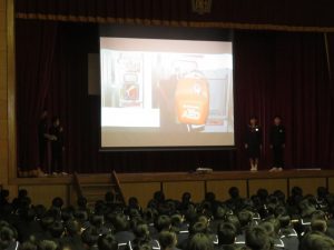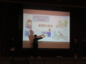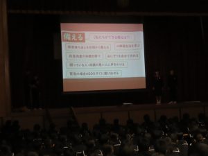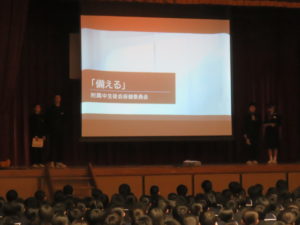 本日の生徒集会は、保健委員会が企画・立案し、身近で起こっている問題や,健康課題に興味関心を持ち,取り組んだことや調べたことを発信することで,これからの生活や行動の仕方について考えてもらう集会となりました。そのテーマは「備える」ということをキーワードとして、次の2つの観点から説明を行いました。