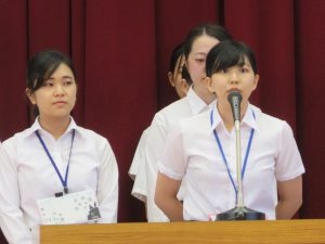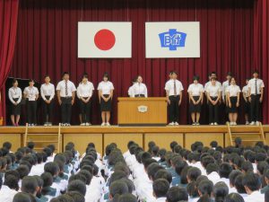 本日から、生徒会役員選挙の活動がスタートしました。今年度は、生徒会長立候補者 7名、書記長立候補者 9名、企画委員長立候補者 9名が1・2年生から立候補がありました。この中から、生徒会長・副会長。書記長・副書記長。企画委員長・副企画委員長の選出が、投票によって行われます。また、本日は、放送委員の協力のもと、事前に撮影し編集された立候補者のメッセージVTRが昼食の時間に各教室で放送されました。