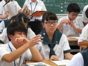 本日、ドイツから6人の大学の先生が来校され、5校時の理科の授業参観を中心に、6校時は、校内参観及び授業等についての協議が行われました。理科の授業は、鹿児島に身近な存在である「火山」のメカニズム等についての学習で、学習課題を「火山の噴火はどのような仕組みで起こるのか。」と設定し、1年生を対象に授業が行われました。参観された方々は、理科の授業で行われる「MI(マイ アイデア)」や、実験などに大きな関心をもたれていたようでした。