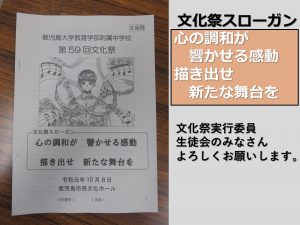10月8日(火)に、生徒会本部役員と文化祭実行員(代議員15名)が中心となって支えてくれた、第59回文化祭を盛会にうちに終えることができました。進行は文化祭実行委員長・副委員長、司会は3年生の中から3人が選出され、思い出に残る文化祭の運営をしてくれました。文化部(吹奏楽部、合唱部、美術部、演劇部)のプログラムをはじめ、各学年ごとのプログラム、英語科、美術科の発表が行われました。