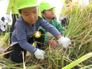 はじまりの式が終わった後,年長児は園庭の田んぼに集合して,稲刈りをしました。