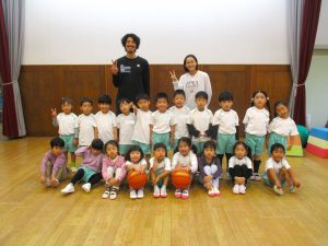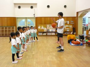 バスケットボールの鹿児島レブナイズで、U18ヘッドコーチを務める安慶大樹さんが来園し、年長児と年中児がバスケットボールの体験をしました。🏀