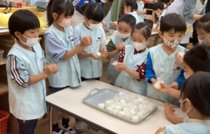 今日は,農学部で育てたお米を使って,うみ組さんがおにぎりづくりを行い,他のクラスにも振る舞いました✨
