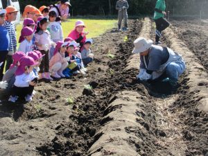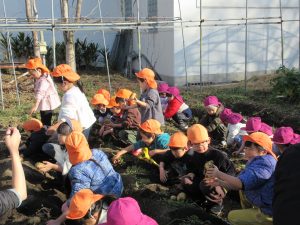 みんなで「大きくな~れ!」と,どんどん植えました。そして,幼稚園のお部屋のテラスには,桜島大根の種も植えました。
