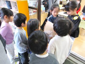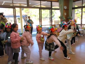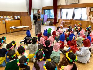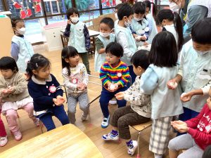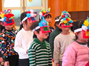 附属幼稚園では,福の神様から豆をもらって豆まきをします。