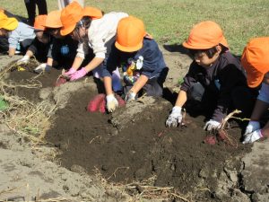 年長と年中が植えた芋が大きくなり,芋掘りを楽しみにしていた子どもたち😊