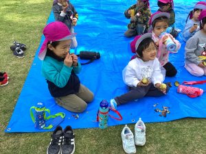 ブルーシートの上で,今日はどんぐりクラブ(未就園児)の子たちも一緒に,できたての焼き芋を食べて,大満足の子どもたちでした☺️☺️☺️