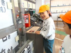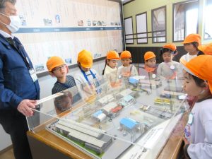 電車の中にある設備の展示について説明を聞いた後,子どもたちは目を輝かせながら触ったり動かしたりました😊