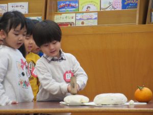 鏡開きの由来を聞き,園長先生がお餅を割る様子をみんなで見ました。
