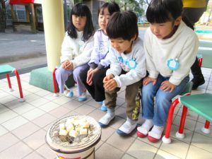 そして,テラスにクラスごとに集まり,七輪で焼いたホカホカのお餅を食べました。