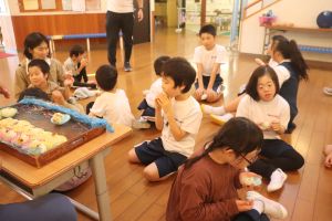 お家から準備してきた手袋や長靴を身にまとい,やる気満々で,クラスごとに芋掘りをしました。蔓を次々に引っ張る子,諦めきれず周辺を掘り続ける子,次々と出てきた大きなさつま芋に大歓声が上がる賑やかな芋掘りでした。