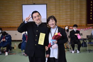 3月7日に「みんなで卒業を祝う会」を行いました。祝う会では,生徒みんなで一緒にダンスをした後,メッセージが書かれた色紙を1,2年生が卒業生にプレゼントしました。卒業生から保護者に向けたメッセージでは,一人一人が小学生のときから高等部3年生までの思い出や感謝の気持ちを伝え,花束をプレゼントしました。生徒たちからのメッセージやプレゼントを受け取った保護者の方からは,これまでの学校生活への思いや成長への喜びなどを伝えていただきました。みんなの思いが伝わる温かい会になりました。