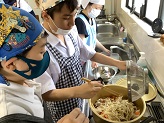 「食」に関する学習では,学年ごとに栄養バランスの取れた献立を考え,実際に調理を行いました。栄養の働きを学び,どのようなメニューを選べばよいか話し合ったり,材料や作り方を調べたりしました。調理後は「大変だったけど,自分たちで作ったごはんはおいしい。」と,生徒同士感想を述べ合っていました。