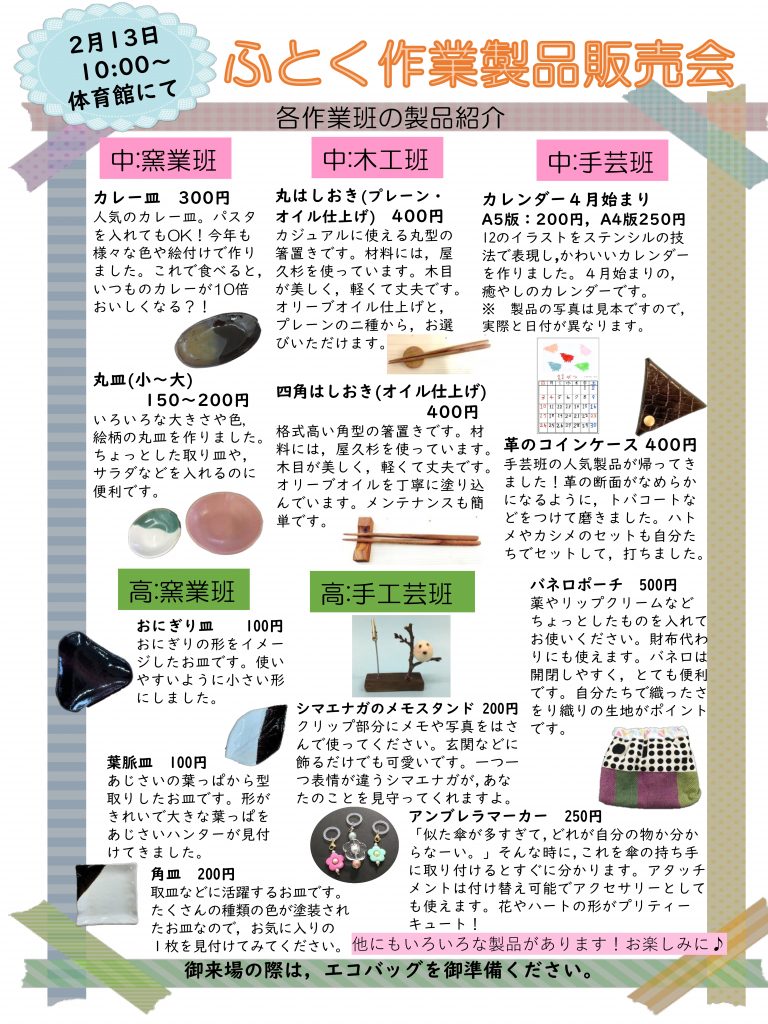 令和8年2月13日(金)10時から,本校体育館にて,ふとく作業製品販売会を実施します。中学部・高等部の生徒たちが,「お客さんが喜ぶ製品は何かな。」,「良品を作るにはどうしたらいいのかな。」と,一生懸命考え,製品製作や販売準備に取り組んできました。当日,店頭には木工製品,窯業製品,手芸製品が並ぶ予定です。製品は,添付のチラシで紹介しているもののほか,数多くの製品を準備しておりますので,お楽しみに!