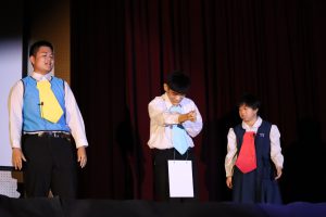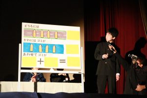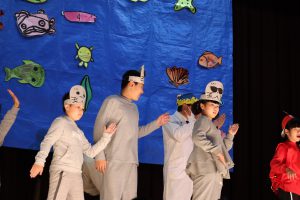 小学部は,様々な海の生き物に扮した児童たちが,「魚の学校」を舞台に国語や算数,体育など,得意なことを発表しました。校長先生も出演し,児童の演技を盛り上げました。