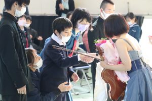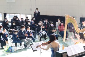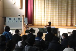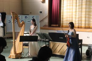 12月20日(火)に本校体育館にて,わくわくコンサート「~弦楽器の調べ~」を開催しました。演奏してくださったのは,鹿児島県内で活躍されているヴァイオリン奏者の木佐貫茜さん,ハープ奏者の飯伏聡子さんです。
